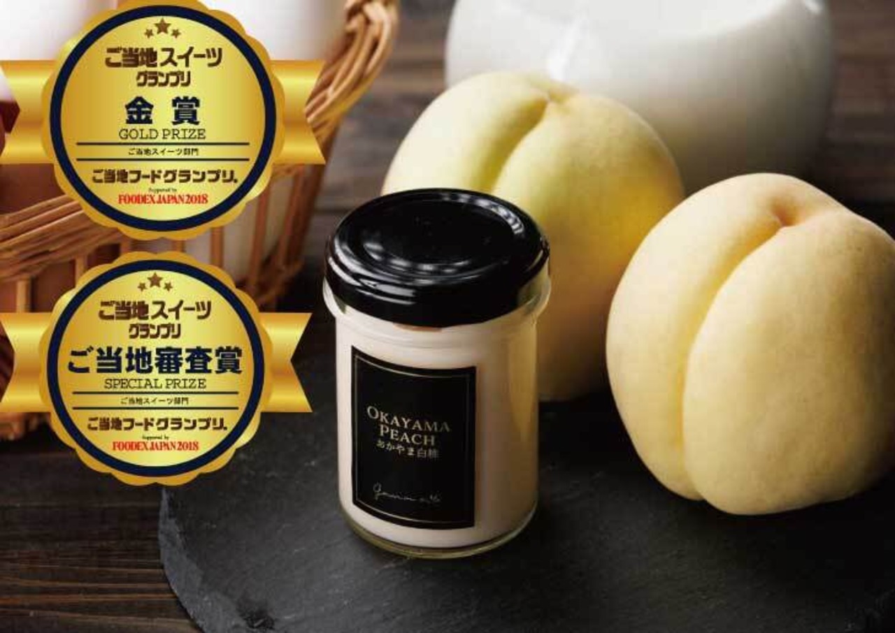 まるで白桃を食べているかのようなジューシなのど越しの良いジュレタイプのぷりん。白桃は、地元の倉敷市の桃農園より直接仕入、弊社で白桃プリンに合うように加工。平成30年 ”食のプロが集まる、アジア最大級の食の展示会「FOODEX JAPAN2018」にて行われた「ご当地スイーツグランプリ」において「金賞」、「ご当地審査員賞」を受賞。